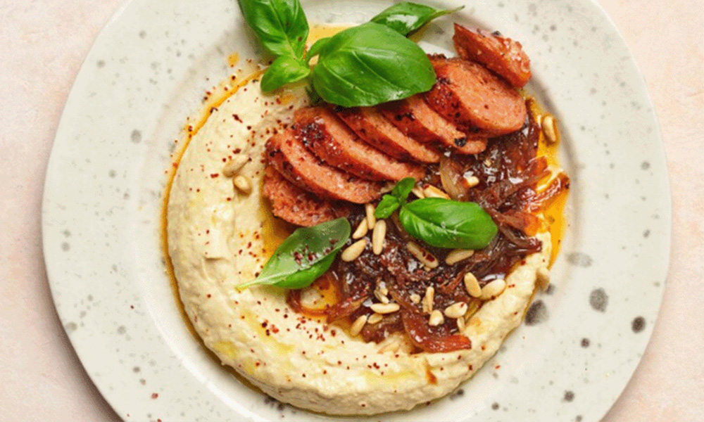 Hummus med karamellisert løk, chorizo og pinjekjerner