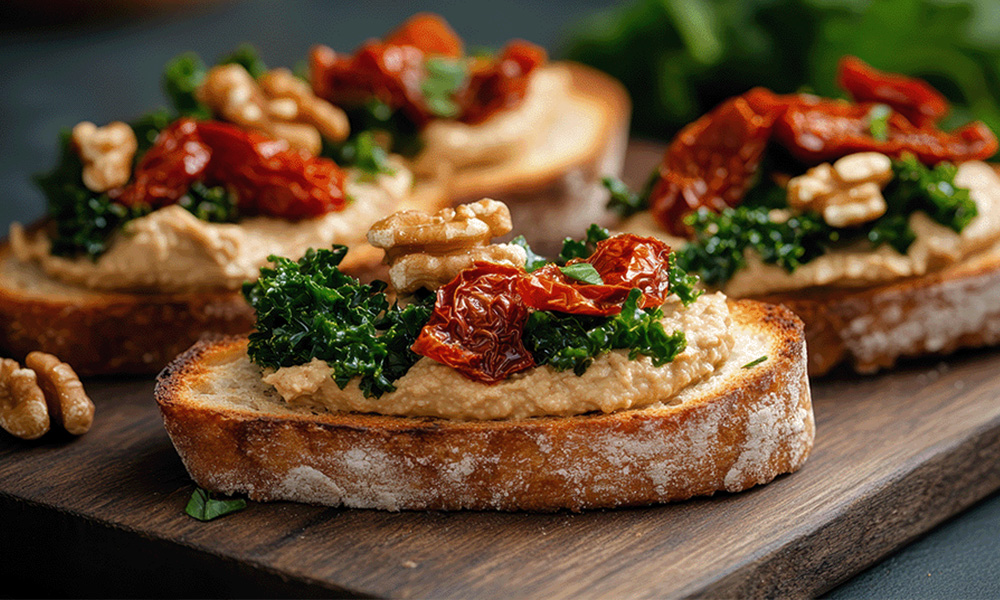 Hummus på ristet brød med grønnkål, soltørket tomat og basilikum